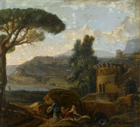 LAVANDIÈRES AT A STREAM, IN A CLASSICAL LANDSCAPE WITH RUINS