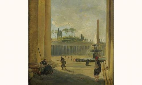 Vue de la place Saint-Pierre avec des pèlerins sous la colonnade