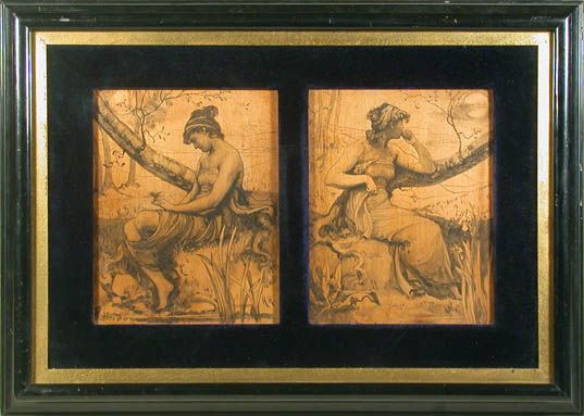 | Doppelarbeit. Auf der linken Seite junge Frau in griechischem Gewand, in Gedanken versunken am Ufer eines Baches sitzend, auf ih | |