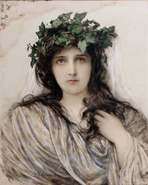 | Head and shoulder portrait of a young lady with flowing black locks and wearing a wreath of ivy on her head | |