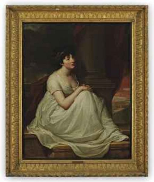| Portrait of Jane Winder, wife of William Charles Monck-Mason of Masonbrook, Co. Kildare, full-length, seated on a ledge in a whi | |