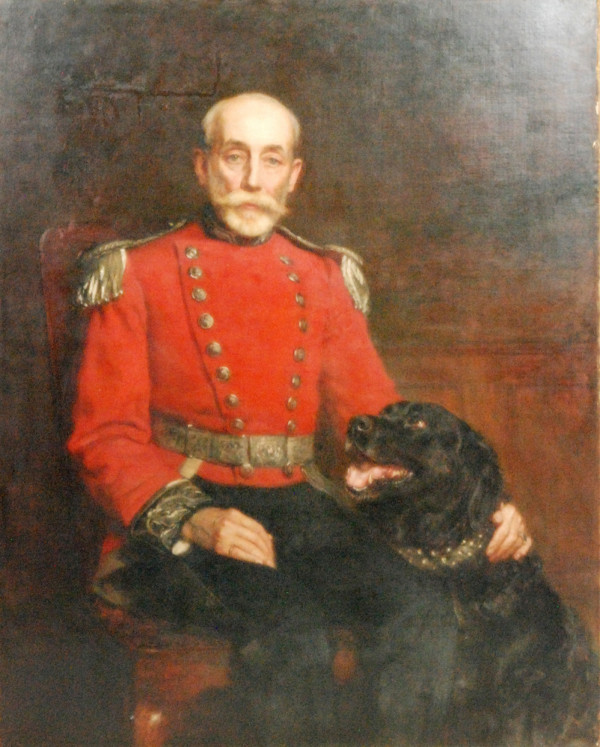 Portrait of an army officer wearing scarlet dress tunic, his labrador beside him