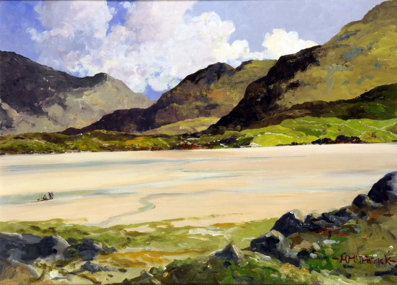 sunny Donegal beach scene, with small cluster of figures on expansive beach at low tide