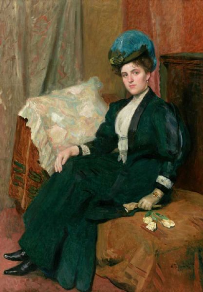Lebensgroßes Portrait einer hübschen jungen Frau, auf Canapé im Salon sitzend