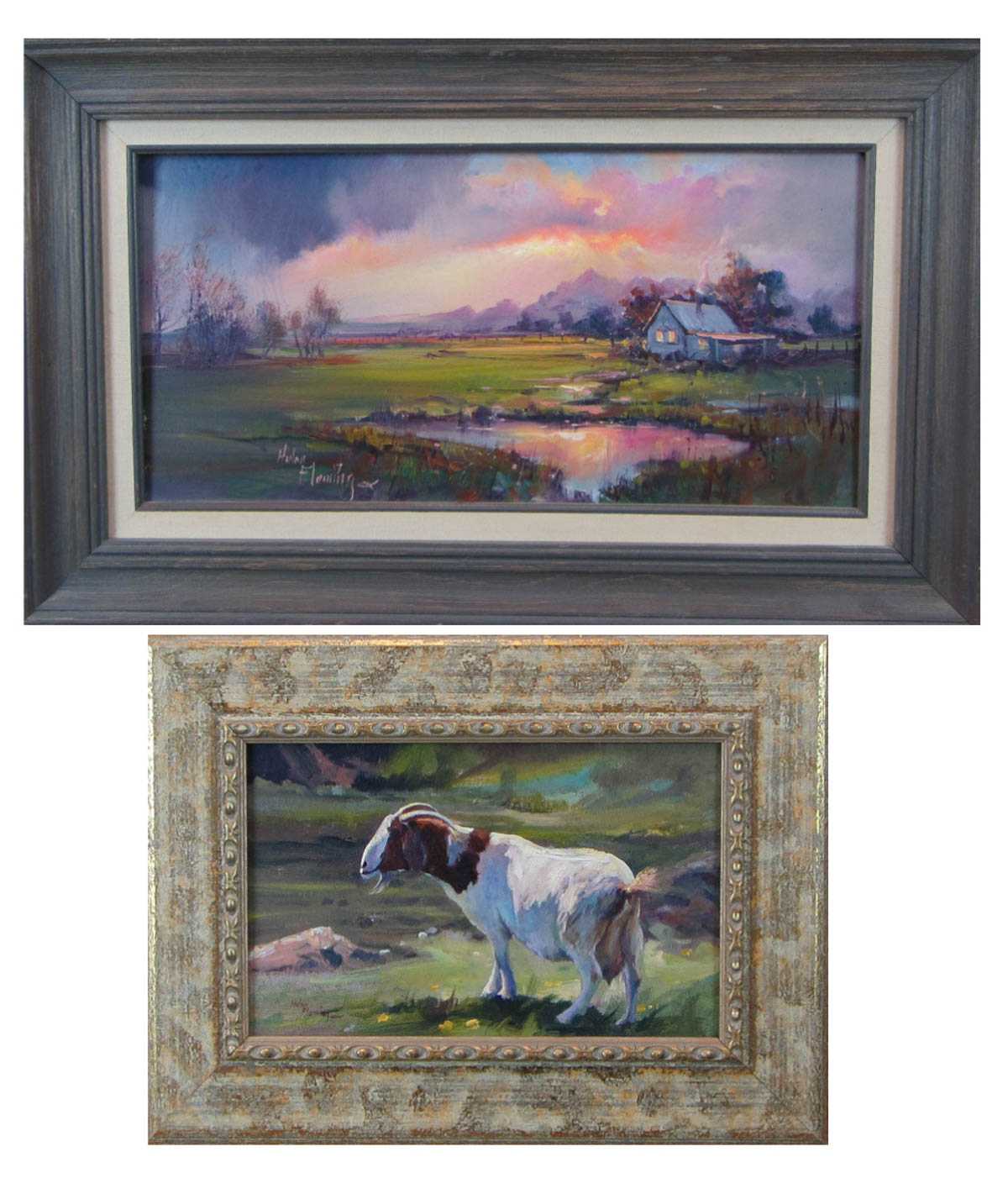 | A nanny goat and a landscape with cottage at sunset | |