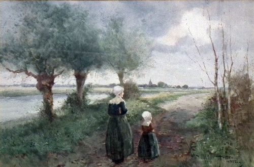 Continental river landscape with two figures to pathway