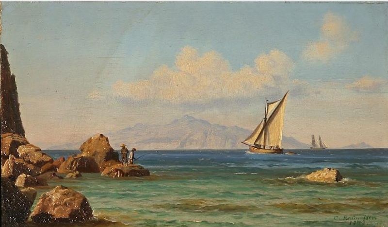 | View from Southern Europe with two boys fishing from a rock near the coast | |