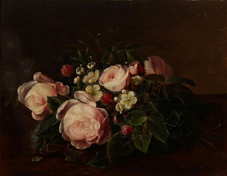 Still life with roses and strawberry flowers.