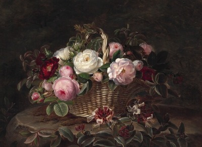 Dark red, white and pink roses in a basket