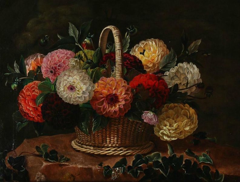 Still life with dahlias in a basket