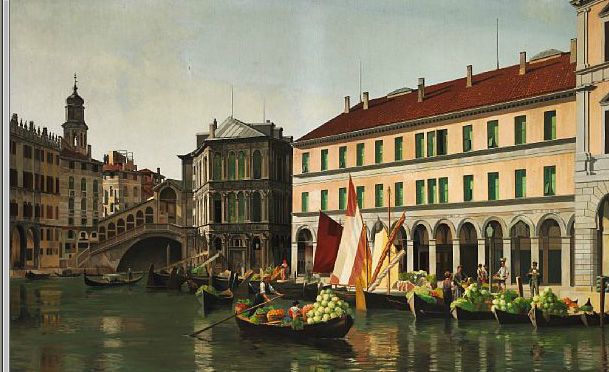 | View of Venice with boats studded with vegetables and fruit near the Rialto Bridge. | |