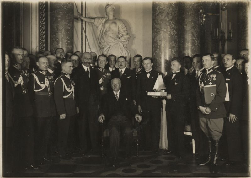 | Prezydent Rzeczypospolitej Polskiej Ignacy Mościcki w towarzystwie m. in. premiera Walerego Sławka i wyższych oficerów Wojska Po | |