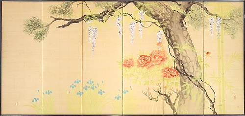 | Ink Pair of large six panel screens, ink and color on silk | |