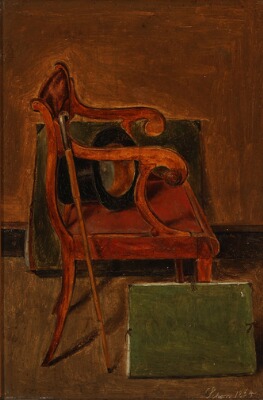 | Interior with a chair, walking stick, top hat and print folders. | |