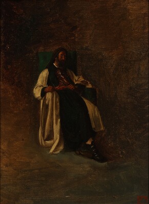 | Interior with a man dressed in middle eastern clothing sleeping in a chair | |