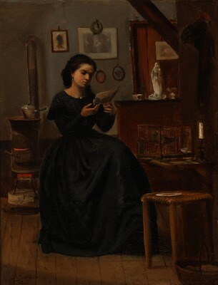 | Interior with a young woman feeding her birds | |