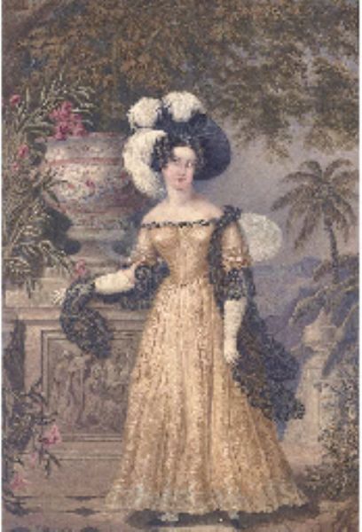 | Lady Rowe, standing small full length on a terrace, a moonlit Jamaican landscape beyond | |