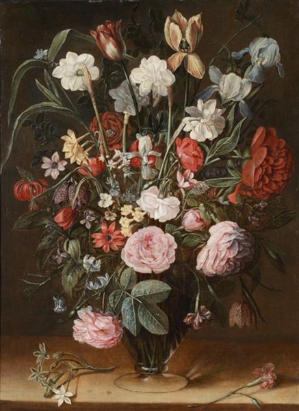 Nature morte au bouquet de tulipes et de roses sur un entablement