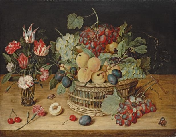 | Carnations, tulips and other flowers in a glass vase with peaches, grapes, and plums in a basket on a ledge with cherries, a but | |