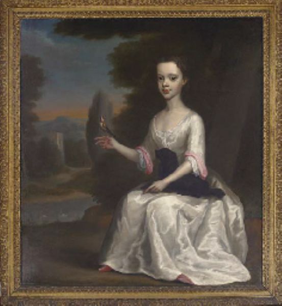 | Portrait of a young girl, traditionally identified as Esther Turpin, full-length, seated in a white dress with pink trim, with a | |
