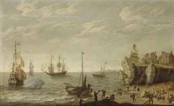 | Dutch merchants at anchor in choppy waters off a rocky coast in a bay with fishermen unloading their catch | |