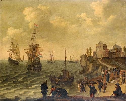| Fishermen with their catch on the shore, shipping at anchor beyond | |