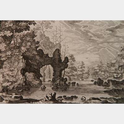 Isaak Major (German ca, 1576-ca. 1645)- ''View of a River with a Natural Arch at Left'' (Le Blanc 13); (Hollstein 12ii/iii)- etching, ca. 1600-30, with the publisher's address at lower right, thread margins or trimmed to plate, a contemporary impress | |