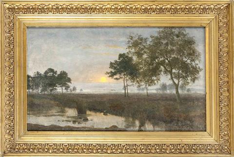 belgischer Landschaftsmaler, Sonnenaufgang über nebelverhangener Landschaft