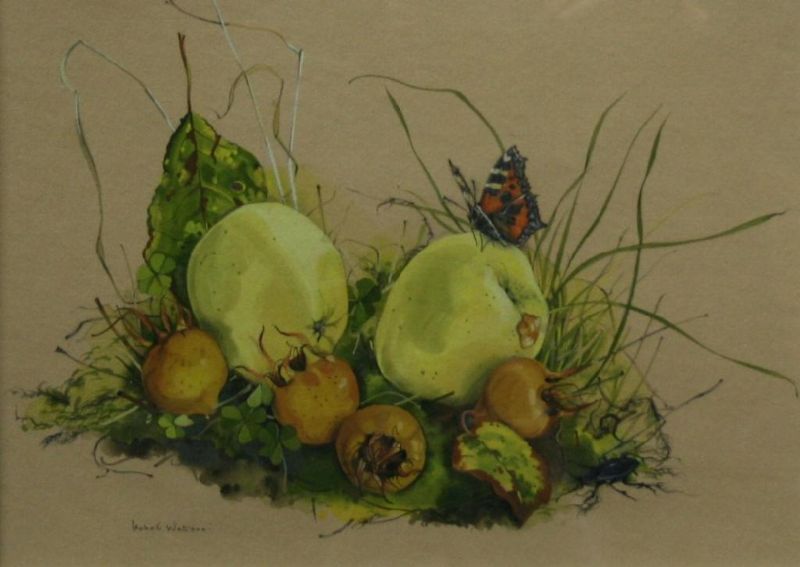| STILL LIFE GREEN APPLES AND MEDLARS, with purple ground beetle and tortoiseshell butterfly | |