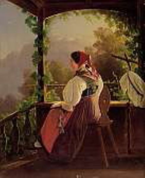 Nidwaldner Trachtenmädchen in Laube sitzend