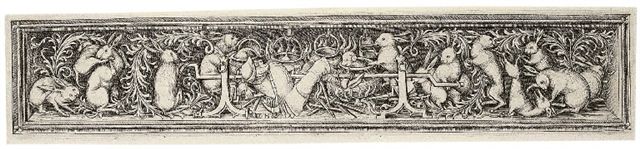Ornament with a hunter being roasted by hares
