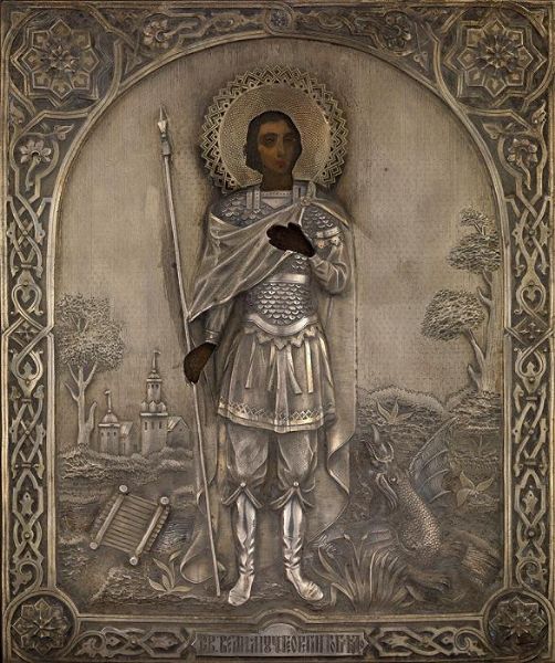 THE GREAT MARTYR GEORGE IN A SILVER OKLAD AND WOODEN KYOT
