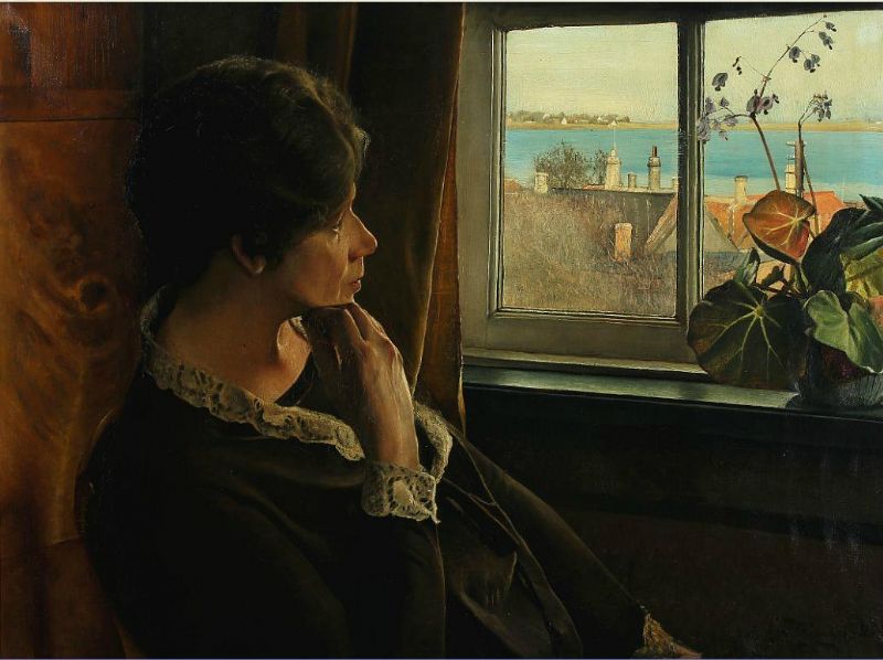 Interior with woman contemplating the view over Sankt Jørgensbjerg and the fjord of Roskilde.