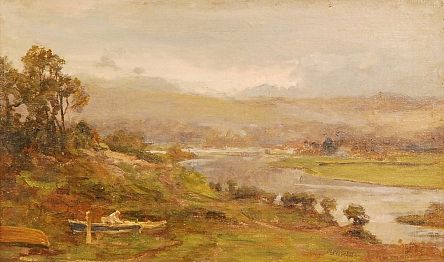 a coastal scene with figures in a boat to the fore and mountains in the distance