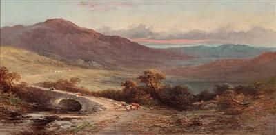 Schottische Landschaft in Abendstimmung mit Schafen und Hirten