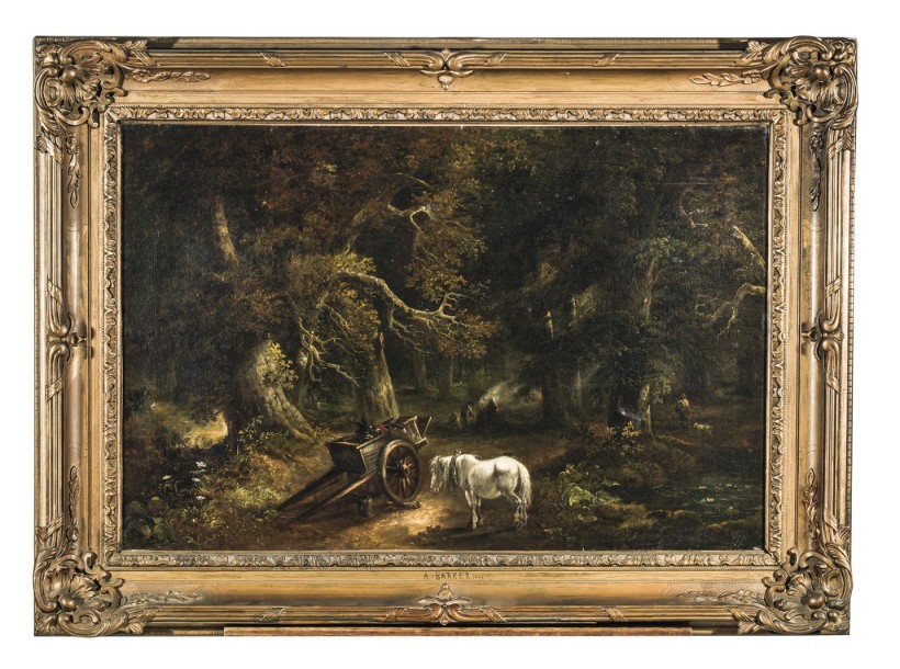 | Personnages, cheval et charrettes au campement dans un sous-bois. | |