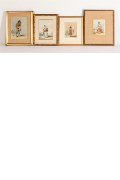 Quatre pièces encadrées représentant des personnages en costumes.