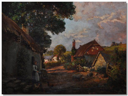 | Village scene with a figure by a thatched cottage, pigs at a trough and hills beyond | |