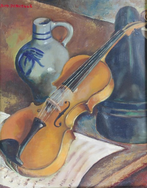 still life study of a violin, jug and sheet music
