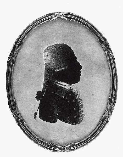 A silhouette portrait of a gentleman, profile to the left, wearing a coat, frilled chemise and tied stock