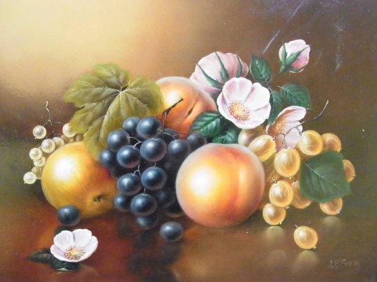 A still life study, peaches, grapes and cherry blossom