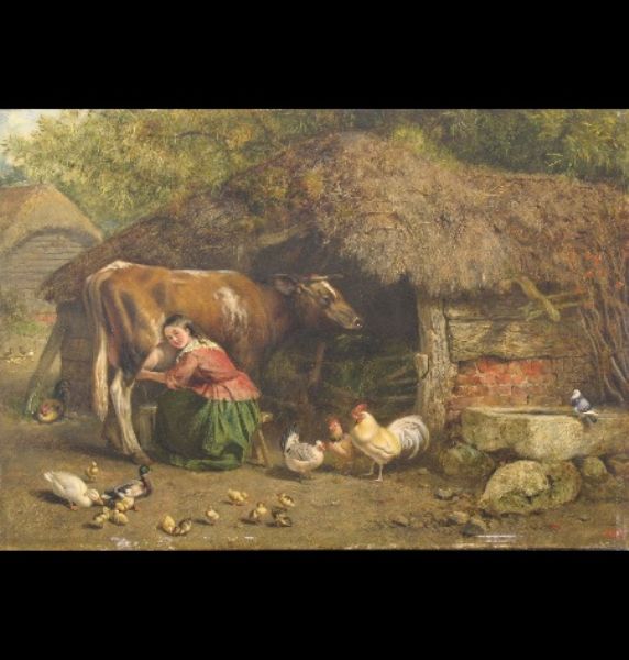 Study of a young girl milking a cow beside a barn with chickens and ducks in the yard