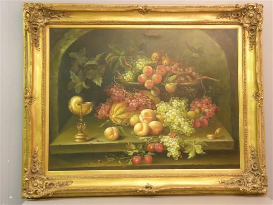 still-life with large basket of fruit within an arch