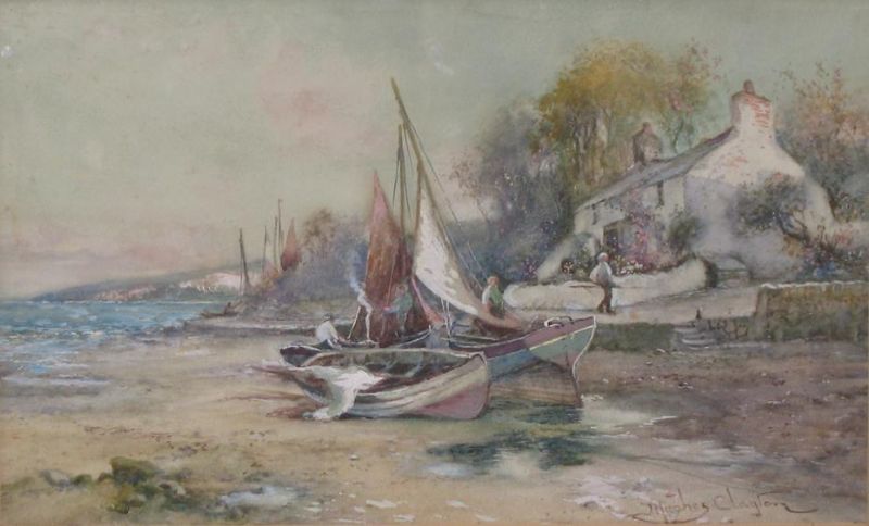 | Fishing boats pulled up on a beach with figures in a house beyond | |