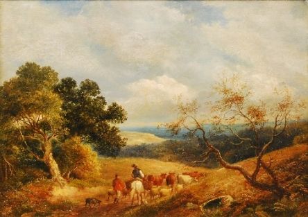 Rural landscape with two drovers cattle and sheep to a pathway with the sea in the distance