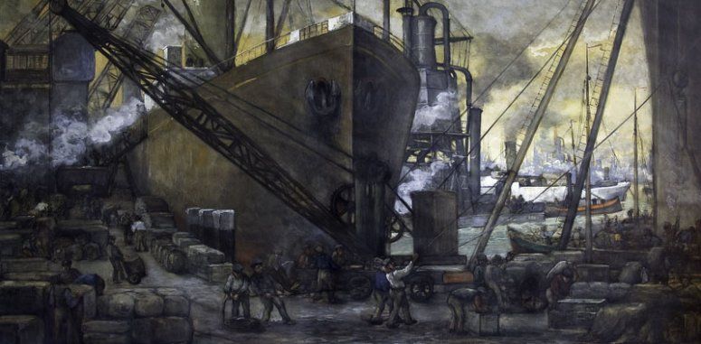 Havenkade met bedrijvigheid, stoomkranen, elevatoren en stukgoedschepen