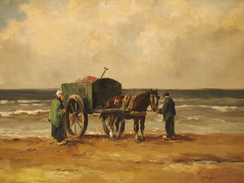 Zwei Bauern mit Pferdekarren am Strand