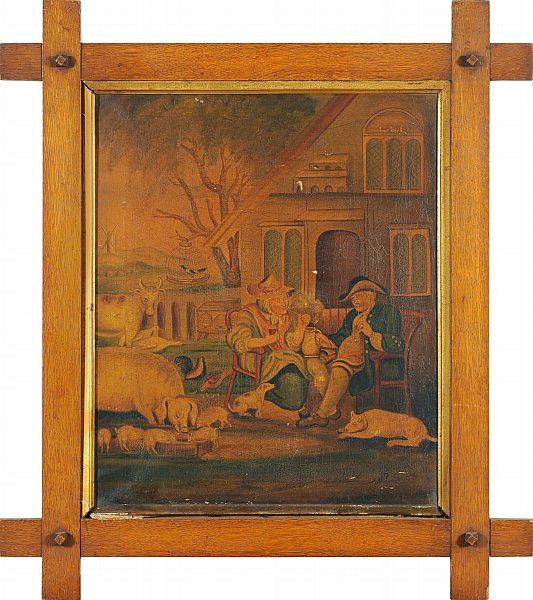 Farmyard scene with two seated figures, animals nearby