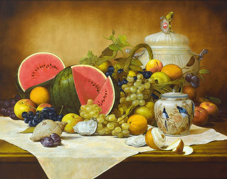 Früchtestilleben mit Melone, Trauben, Orangen, Äpfeln, Pflaumen, Austern und Schnecke