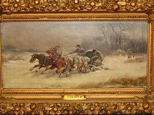 A pair of winter scenes, troikas being pulled at a gallop, huntsmen and dogs aboard